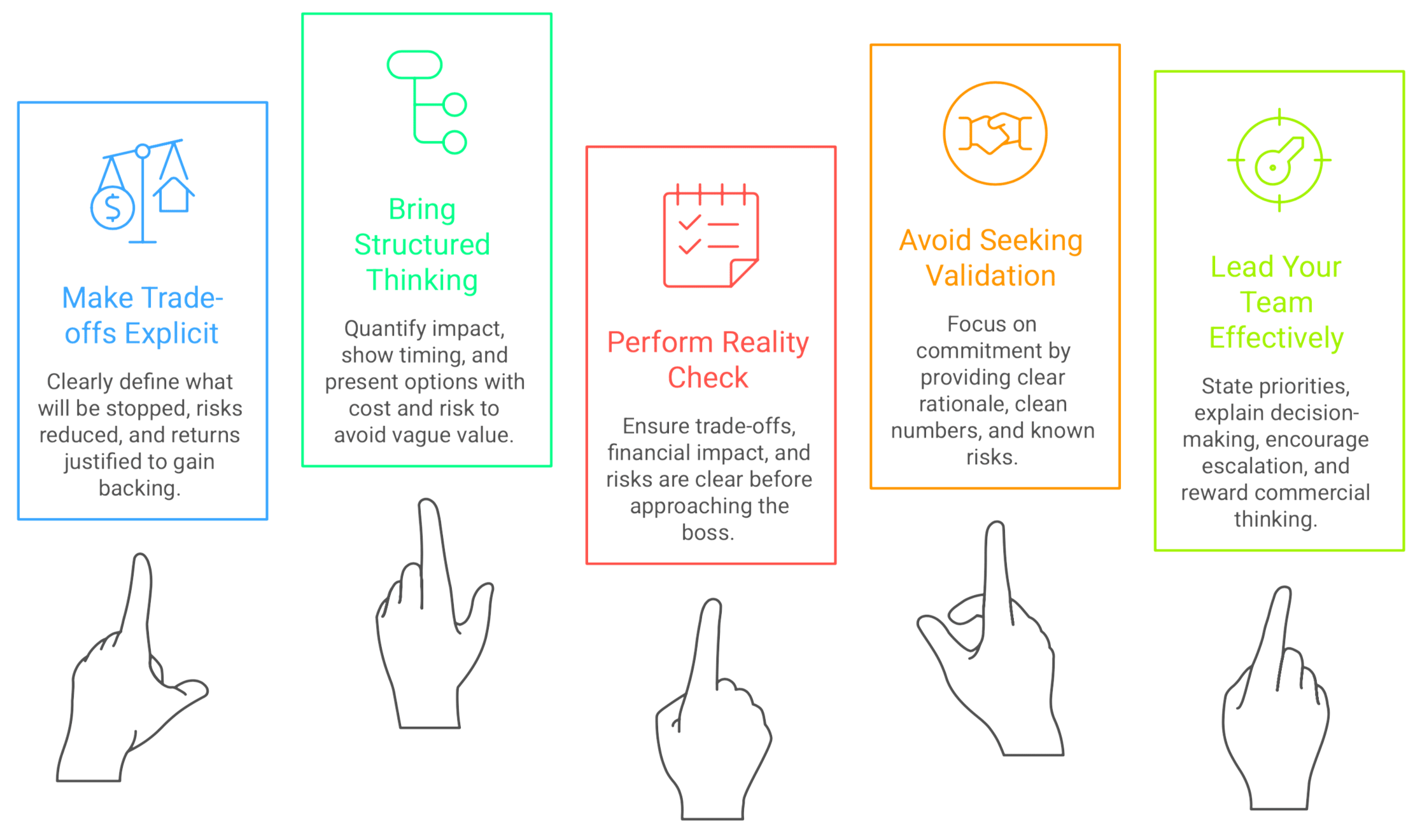 Reward and promote people who think commercially and present structured options rather than complaints.